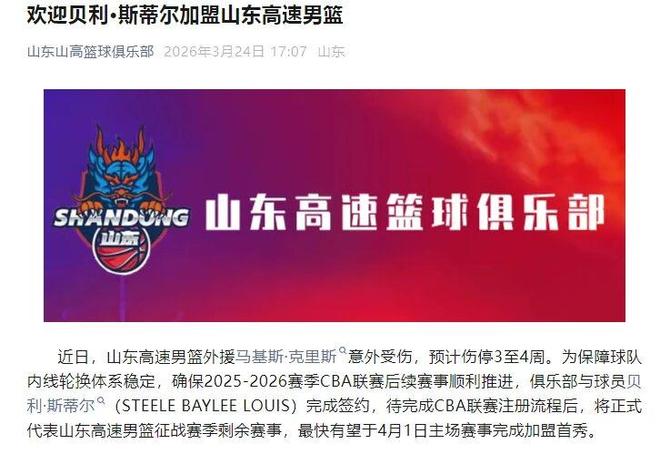 CBA常规赛已经到了竞争最为激烈的时候,克里斯的受伤对山东男篮来说是个很大打击。克里斯受伤后,山东男篮管理层也制定出了紧急应对策略,决定再找一位救火大外援。就在日前,山东男篮官宣,球队已经和大外援贝利-斯蒂尔完成了签约。球队正在为他办理相关手续,斯蒂尔最快有望在4月1日对阵福建男篮的比赛中代表山东男篮出战。