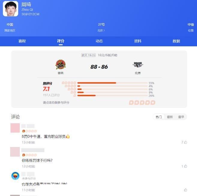 中华网《吉林男篮爆冷88:86击败北京首钢 周琦罚球成关键败因》发布时间:2026.3.24体坛周报《CBA | 太离谱!周琦8罚0中+连续罚丢12球:赛季罚球命中率仅47.4%》发布时间:2026.3.24凤凰网体育《这就是中国的顶薪中锋!周琦连续12罚不中+赛季罚球命中率47.4%》发布时间:2026.3.24