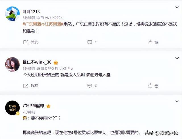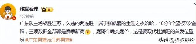 博主“我耀说球”点评说道:广东队主场战胜江苏,久违的两连胜!属于张皓嘉的生涯之夜哈哈,10分8个篮板2次盖帽,三项数据全部都是赛季新高,嘉哥今晚变嘉爷,这是要取代杜润旺的首发位置。