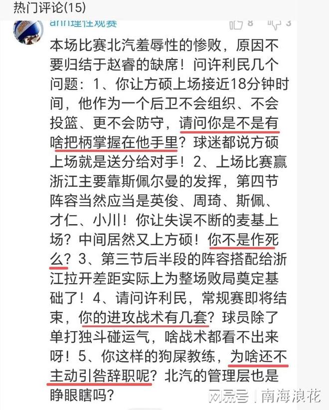 北京球迷更是众口一词对准许利民,严重质疑他的临场指挥,直接四问许利民:1、你让方硕上场接近18分钟时间,他作为一个后卫不会组织、不会投篮、更不会防守,请问你是不是有啥把柄掌握在他手里?2、上一回合赢浙江主要靠斯佩尔曼的发挥,第四节阵容当然应当是英俊、周琦、斯佩、才仁、小川!你今天让失误不断的麦基上场?中间居然又上方硕!你不是作死么?3、请问许利民,常规赛即将结束,你的进攻战术有几套?球员除了单打独斗碰运气,啥战术都看不出来呀!4、你这样的GS教练,为啥还不主动引咎辞职呢?北汽的管理层也是:睁眼瞎吗?