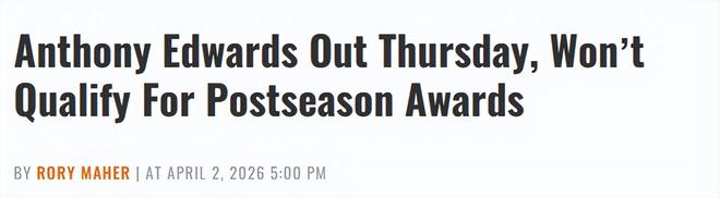 即便爱德华兹在今日之后打完森林狼剩余的全部6场常规赛,本赛季总出场数也将达到65场。但其中一场他仅出战3分钟,不计入65场有效出勤,因此他依旧无法满足奖项评选门槛。