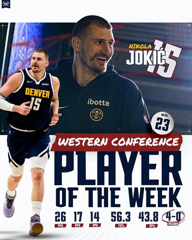 这是约基奇本赛季第三次斩获该奖项,职业生涯至今已20次当选西部周最佳,位列掘金队史首位。