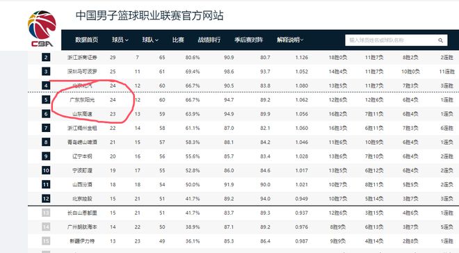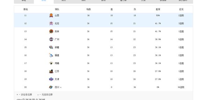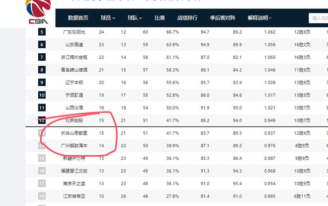 此外,季后赛争夺战同样激烈,第12名北控和第13名吉林胜场数相同,均为15个;第14名广州仅落后他们1个胜场,季后赛最后1张入场券基本在他们三队中诞生。