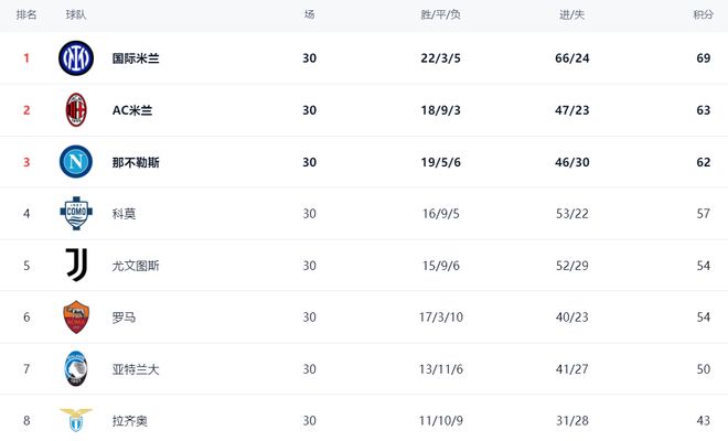 在积分榜上,国际米兰依然占据榜首位置,战绩是22胜3平5负,拿到69分,排名第1。第2名的AC米兰只拿到63分,落后6分,争冠希望不大。那不勒斯紧随其后,拿到62分。第4名是大黑马科莫,拿到57分。尤文图斯只拿到54分,排名第5。罗马赢球之后,也是54分,排名第6。亚特兰的以50分排名第7。拉齐奥只拿到43分,排名第8。