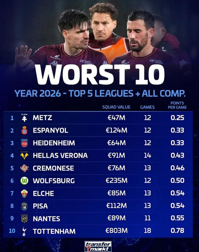 北京时间3月24日,德转统计出了2026年至今各项赛事场均积分最低的10支欧洲五大联赛球队,梅斯以0.25分位列倒数第一,西班牙人0.33分倒数第二,沃尔夫斯堡和托特纳姆热刺上榜。