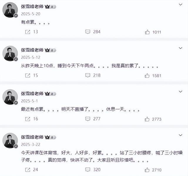 随手一翻,张雪峰无数次在社媒中提到一个字:累。