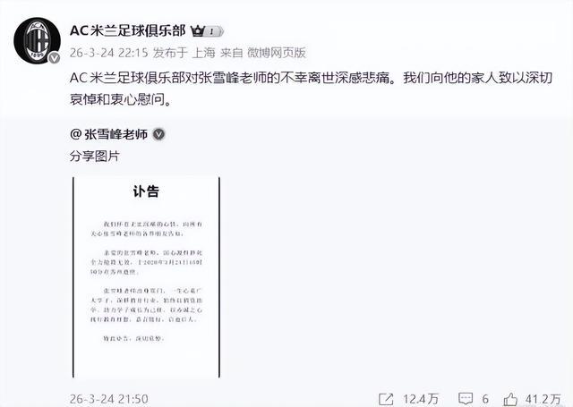 3月24日晚上,手机上推送的一则消息,瞬间令人唏嘘感叹。张雪峰猝然离世,看到网友感慨失去了一位教育引路人,AC米兰足球俱乐部官博发文衷心慰问。