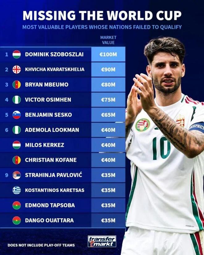 世欧预附加赛进入决赛阶段,德转官方统计无缘今夏世界杯身价最高的球员。匈牙利当家球星、利物浦中场索博斯洛伊以1亿欧领衔。