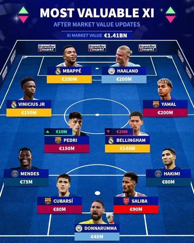 其中西甲联赛球员中,身价最高的为亚马尔、姆巴佩,他们的身价均为2亿欧,英超联赛身价最高的球员则是哈兰德,他目前的身价也是2亿欧,德甲联赛身价最高的球员为目前效力于拜仁的奥利塞,他的身价为1.4亿欧,法甲联赛身价最高的是效力于巴黎的内维斯,他目前身价为1.1亿欧。意甲方面,身价最高的是来自国米的劳塔罗,他目前身价为8500万欧,排在这份榜单第29的位置。
