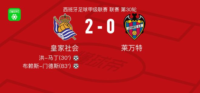 北京时间4月4日西班牙足球甲级联赛 联赛 第30轮,皇家社会主场对阵莱万特。皇家社会洪-马丁破门,布赖斯-门德斯破门。最终比分皇家社会 2-0 莱万特。