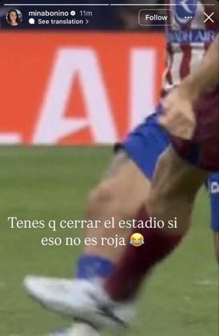 巴尔韦德妻子米娜发布社媒表示:“如果这都不算红牌,那这球场真该关门了。”