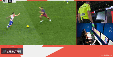 第45+7分钟,冈萨雷斯绊倒亚马尔,主裁判观看VAR后向前者出示直红