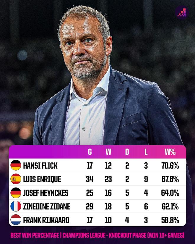 据统计,弗里克总共带领拜仁和巴萨征战17场欧冠淘汰赛,取得12胜2平3负的优异战绩,这位德国教练是欧冠淘汰赛阶段至少执教10场胜率最高的主教练。