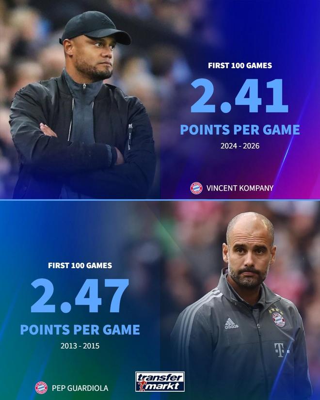 在拜仁客场2-1击败皇马后,孔帕尼带领球队100场比赛已取得76场胜利(13平11负)。根据德国转会市场的统计,孔帕尼的场均积分为2.41分,同样仅次于瓜帅(2.47分)。