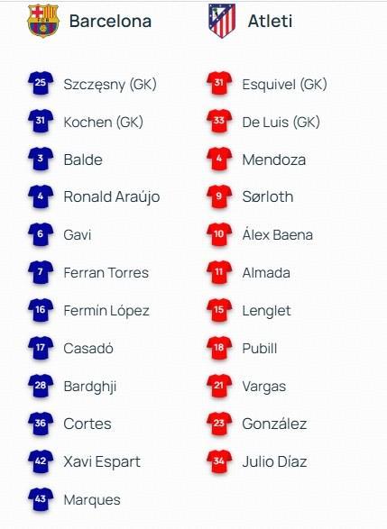 巴萨vs马竞:亚马尔PK格列兹曼,拉什福德、阿尔瓦雷斯出战